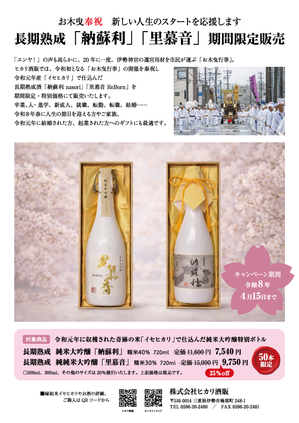 お木曳奉祝 新しい人生のスタートを応援します 長期熟成「納蘇利」「里慕音」期間限定販売