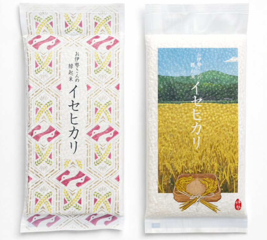 毎年パッケージを変えて、伊勢らしさを表現しています。令和7年産のイセヒカリは、伊勢や斎庭稲穂の神話から着想しました。一つは、伊勢型紙職人「型屋2110」さんが彫った型紙の型染めを採用したもの。